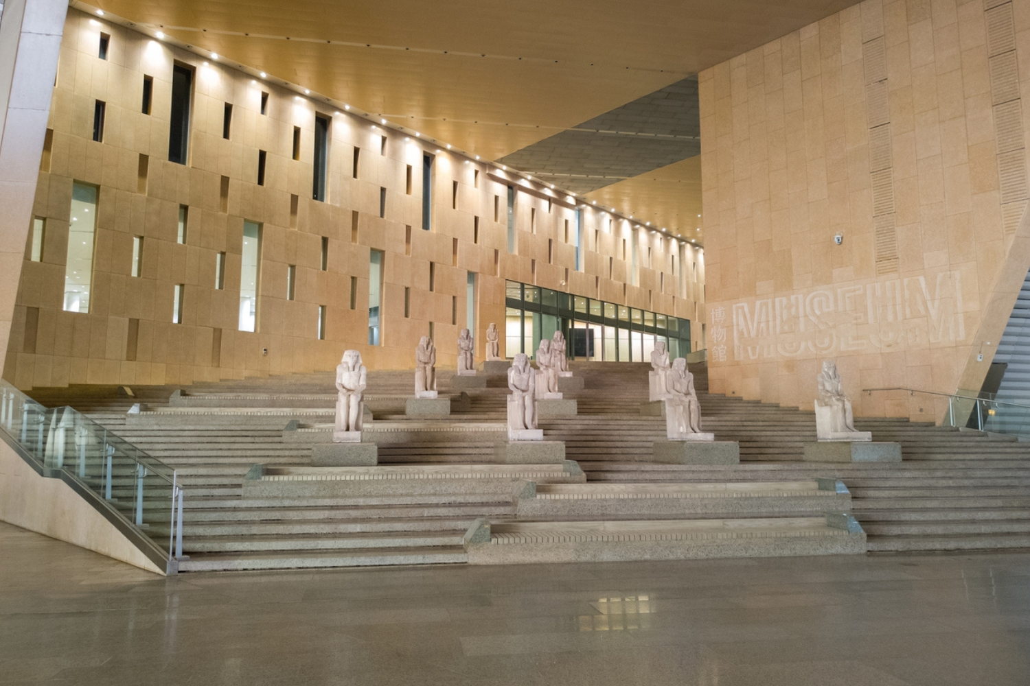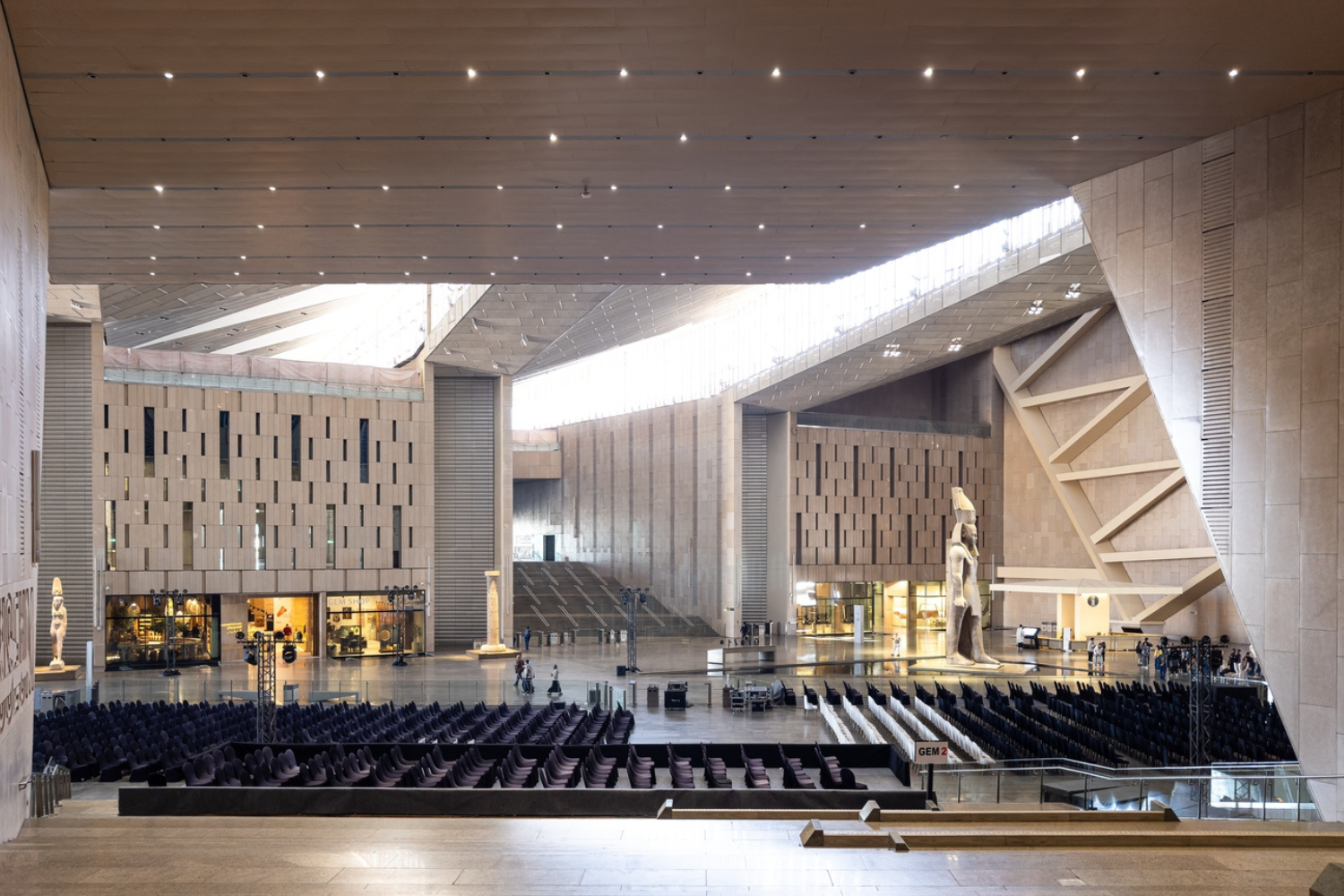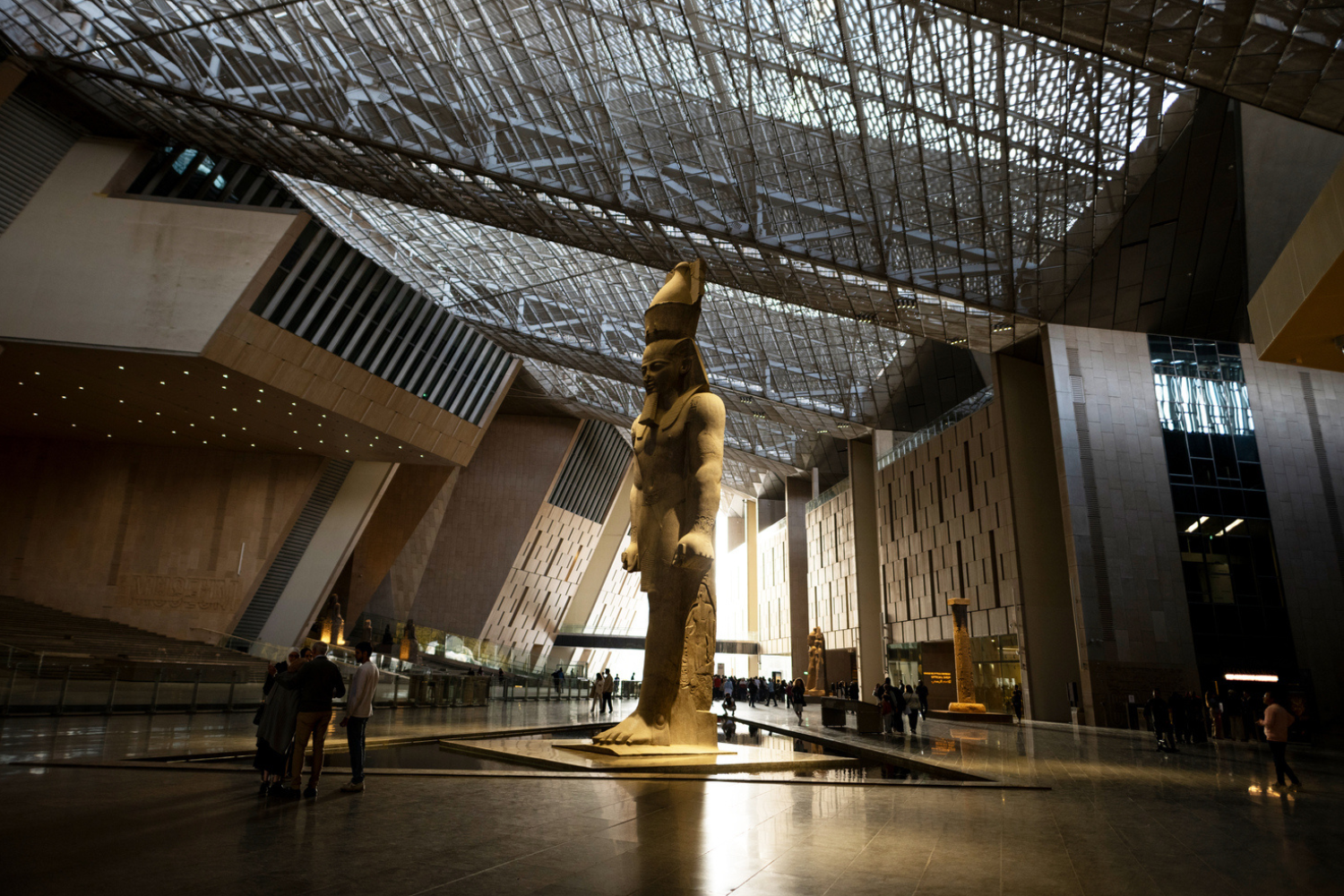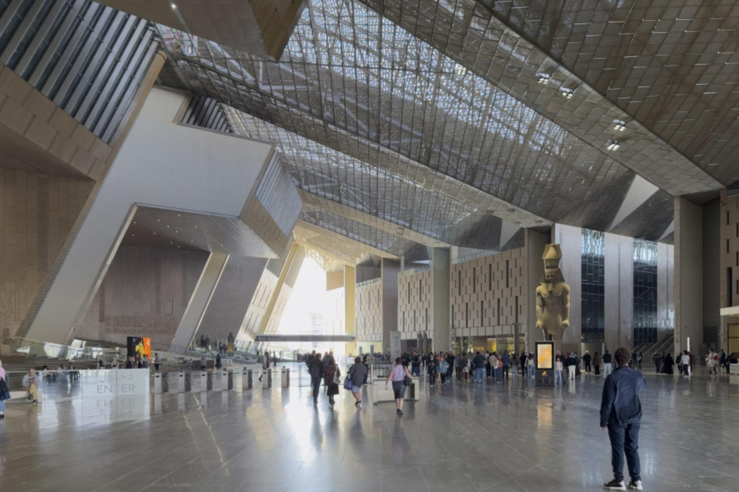 Посетитель входит через открытую площадь и сразу попадает в атриум высотой шесть этажей. В центре — 11-метровая статуя Рамсеса II. Она не просто артефакт, а структурный элемент: вокруг нее организовано первое пространство. Отсюда начинается подъем по широкой лестнице — вдоль витрин и скульптур — к основным галереям.