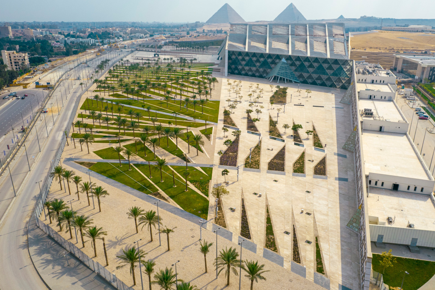 Площадку для музея выбрали на стыке городской черты Каира и пустынного плато. Это место связывает археологическую зону и современную инфраструктуру. Здесь проходит главная ось движения туристов и одновременно начинается природный склон, ведущий к Гизе. Архитектура должна была встроиться в этот переход.