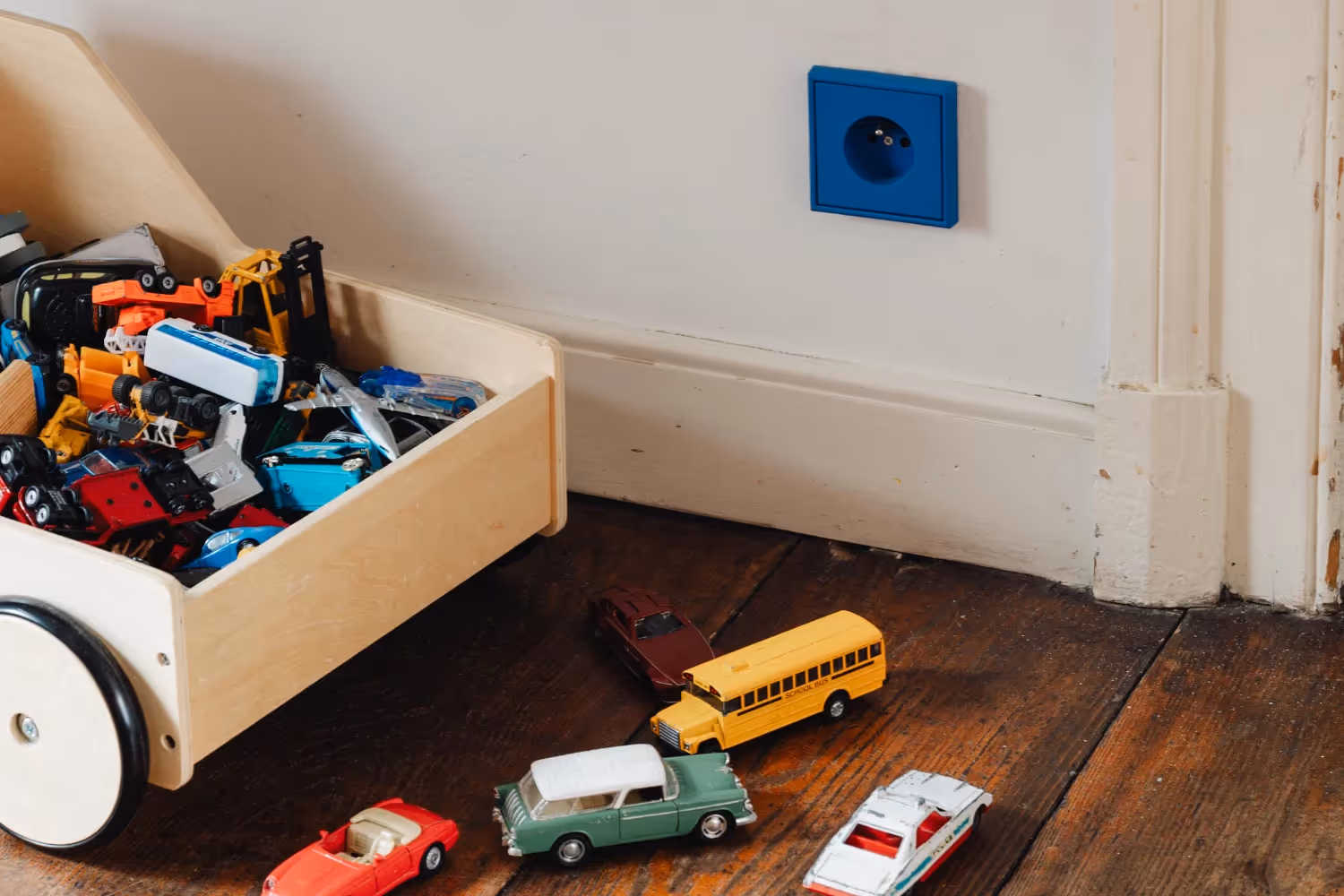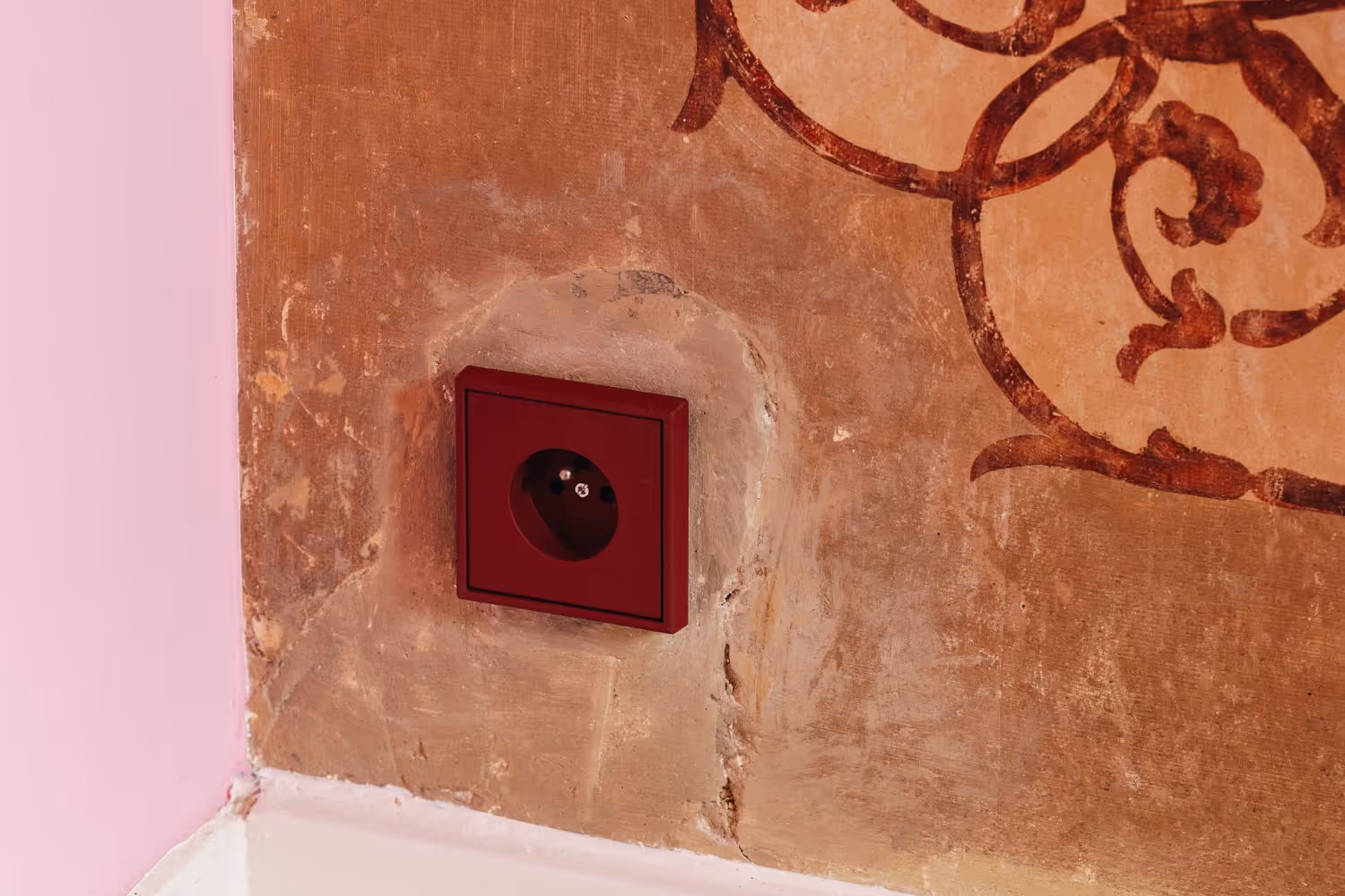 В электроустановке Верлинден использует линейку Les Couleurs® Le Corbusier® — готовую цветовую систему JUNG, построенную на палитре модернистского архитектора. Выключатели и розетки здесь — не нейтральный фон, а активный элемент. Их выбирают под краску стен, а не наоборот.