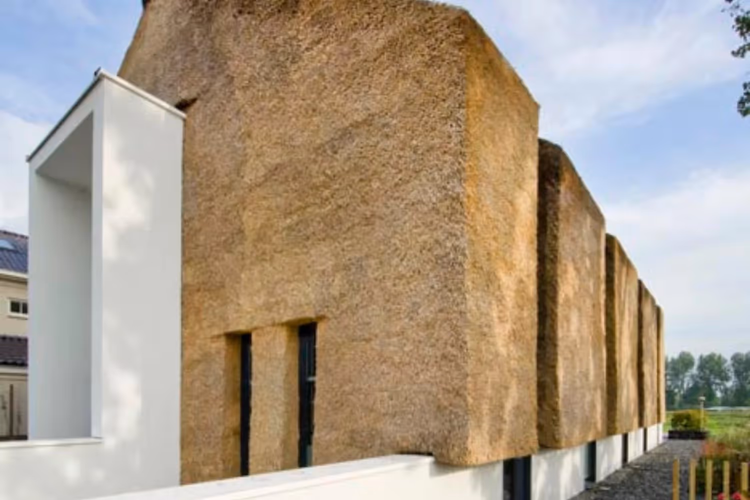 В Нидерландах студия Arjen Reas Architects обернула крыши и стены жилых домов камышом, описывая его как «теплое пальто» для здания. Такой слой не только гармонирует с ландшафтом, но и помогает поддерживать комфортную температуру внутри, снижая затраты на отопление и охлаждение.