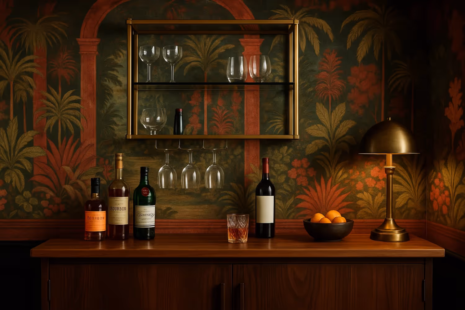 В обычной планировке барная зона часто остается второстепенным элементом — это может быть ниша, уголок кухни или участок стены в гостиной. Но с помощью обоев она легко превращается в отдельное, эмоционально окрашенное пространство. Рисунок и фактура задают фон, который сразу считывается как особая зона, а не просто место для хранения бутылок и бокалов.