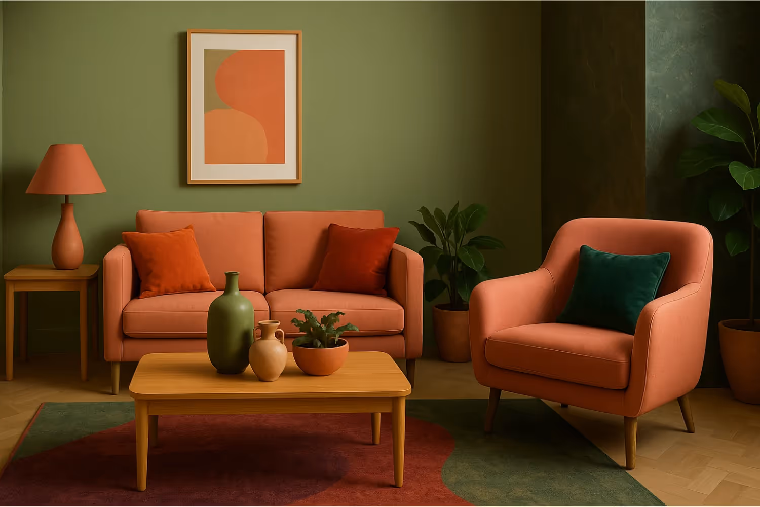 Оттенок гуавы можно использовать как главный цвет комнаты, но для этого важно продумать окружение. Полное окрашивание стен и мебели в единой палитре создает эффект цельного пространства, который особенно хорошо работает в гостиных, столовых и зонах отдыха. Такой прием задает теплое, дружелюбное настроение и визуально смягчает геометрию комнаты.