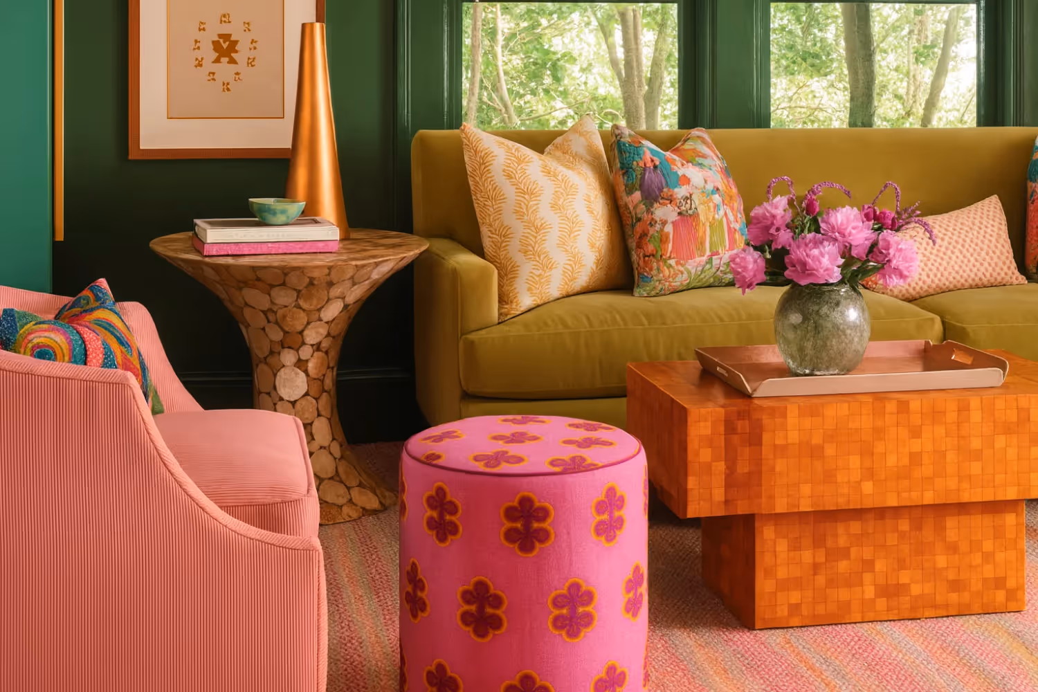 Чтобы цвет не казался чрезмерно «конфетным», его дополняют материалами с естественной текстурой. Теплое дерево, ротанг, джут, лен или травертин нейтрализуют излишнюю яркость и делают интерьер более тактильным. Насыщенность гуавы можно регулировать: в приглушенной версии она смотрится универсальнее и дольше сохраняет актуальность, в яркой — становится главным акцентом и задает характер всему пространству.