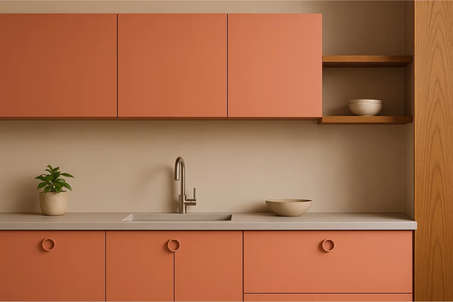 Если стены, окрашенные в цвет гуавы, кажутся слишком яркими для повседневного восприятия, можно ограничиться небольшими, но заметными зонами. Это могут быть фасады кухонных шкафов, дверцы кухонного острова, полки, ниши или отдельные панели. Такой прием добавляет интерьеру тепла и индивидуальности, но не перегружает пространство.
