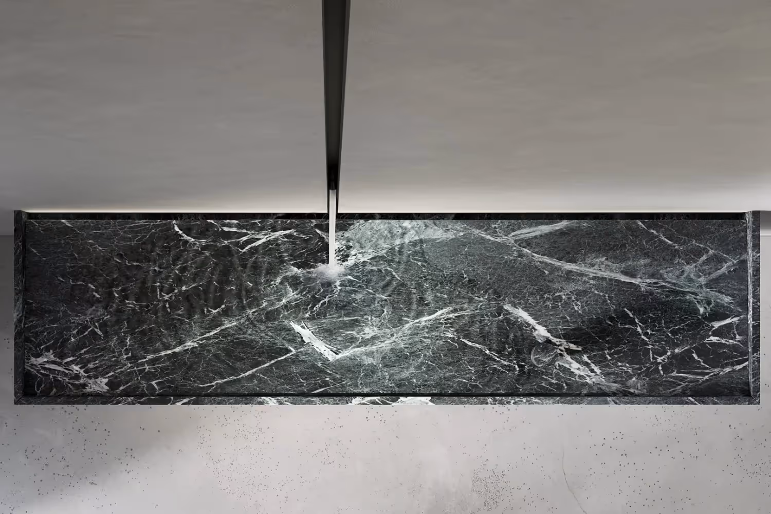 Вместо привычного рычага — каменная ручка, похожая на кусок речного валуна. Она тяжелая, тактильная и при этом четко встроена в композицию. Обычное действие — открыть воду — становится осмысленным.