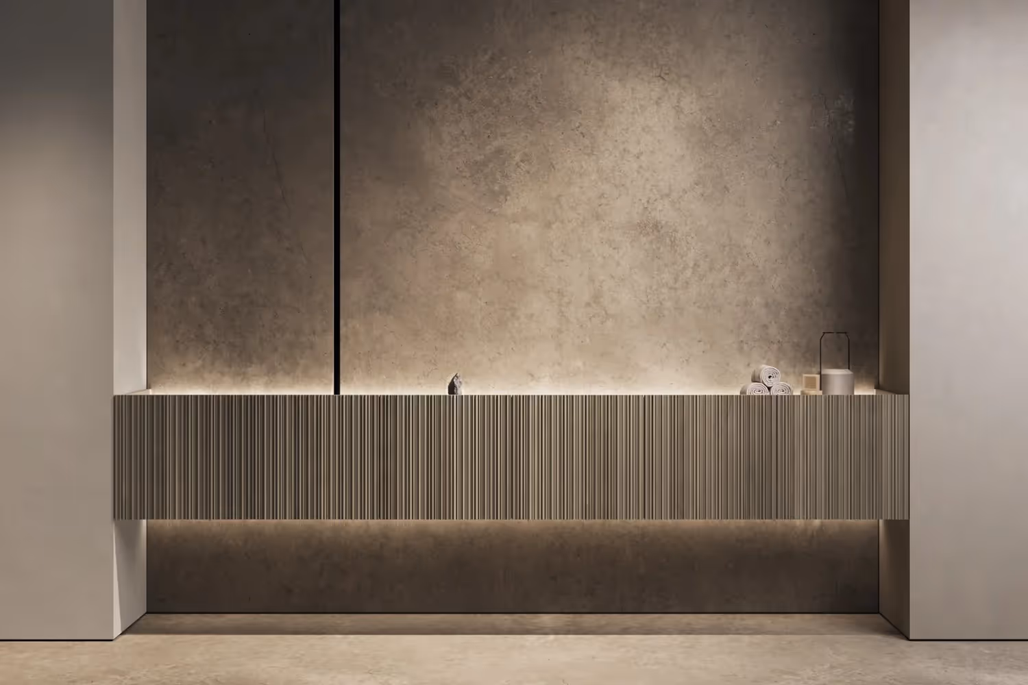 Важную роль играет свет. Узкая световая линия вдоль надреза подчеркивает форму, делает ее почти невесомой. В некоторых вариантах подсветка добавляется снизу — создается эффект, будто раковина висит в воздухе.