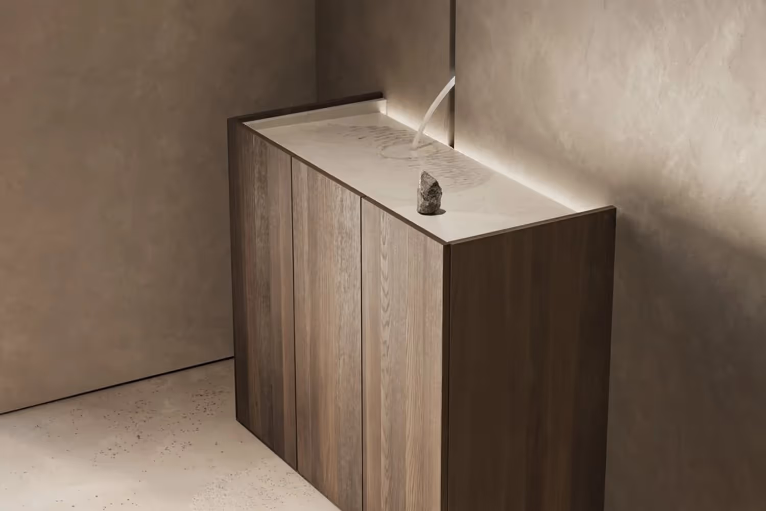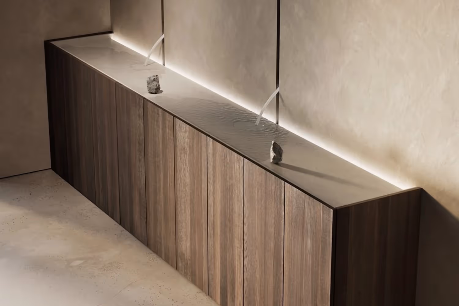 Lineadacqua устроена просто: узкий вертикальный вырез в стене, почти незаметный, пока не включишь воду. Поток воды становится центральной точкой — он задает ритм и притягивает взгляд. Остальное пространство работает уже вокруг него.