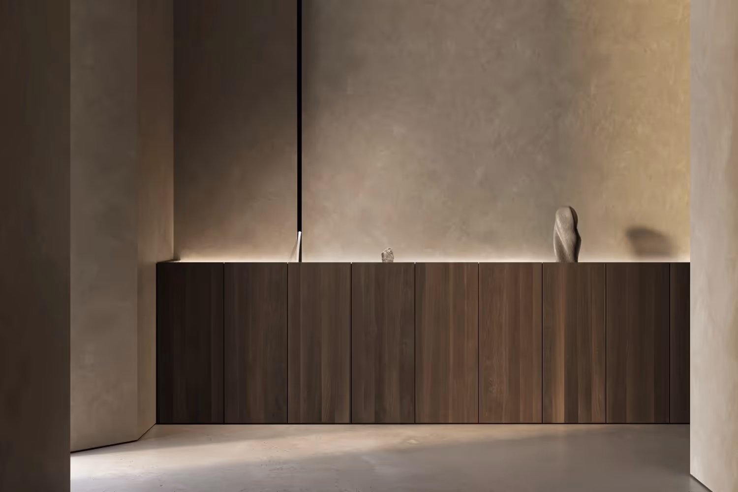 Даже шкафы здесь не выглядят как мебель. Они не стараются привлечь внимание, но у них выразительная фактура, которую хочется трогать. Все работает на ощущение: тишина, простота, внимание к моменту.