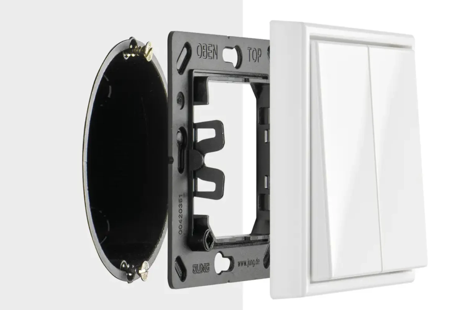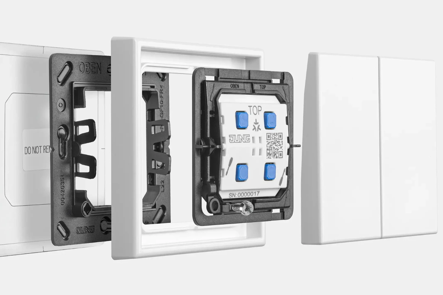 Пульт JUNG Matter разработан для быстрой установки без вмешательства в электропроводку. Он не требует инструментов, коробок или дополнительных аксессуаров — все необходимое входит в комплект. Устройство можно закрепить на любой поверхности: с помощью клейкой подложки на стекло, мебель или плитку, либо установить в стандартную монтажную коробку с опорной рамкой для скрытого монтажа.