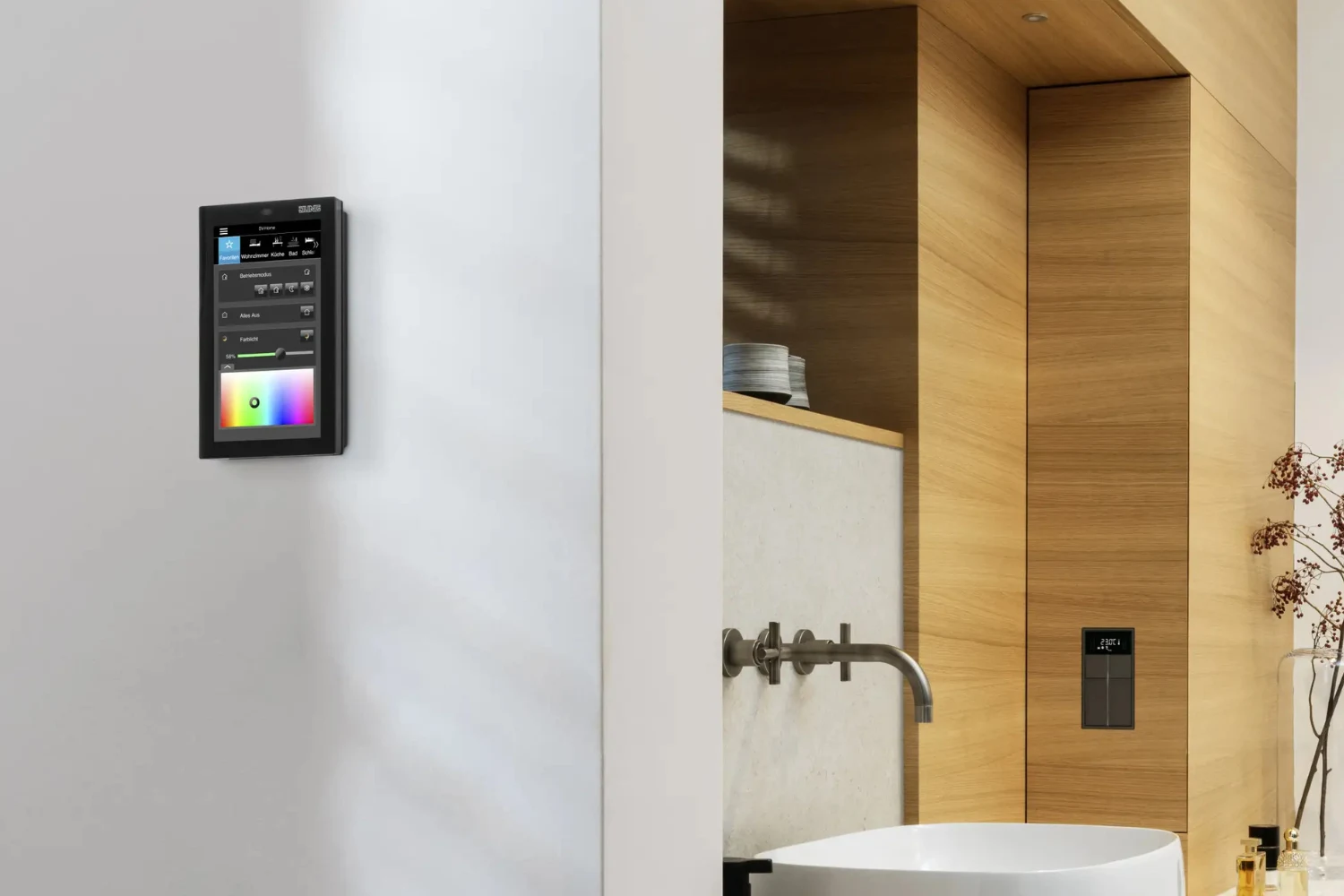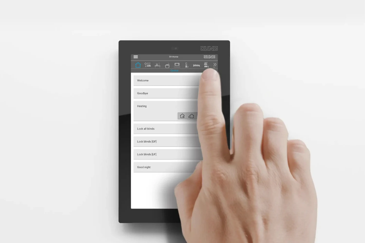 Сенсорные дисплеи JUNG делают управление зданием частью повседневного пространства. Панель не выделяется, она вписывается в интерьер по форме и цвету, оставаясь просто удобным инструментом управления.