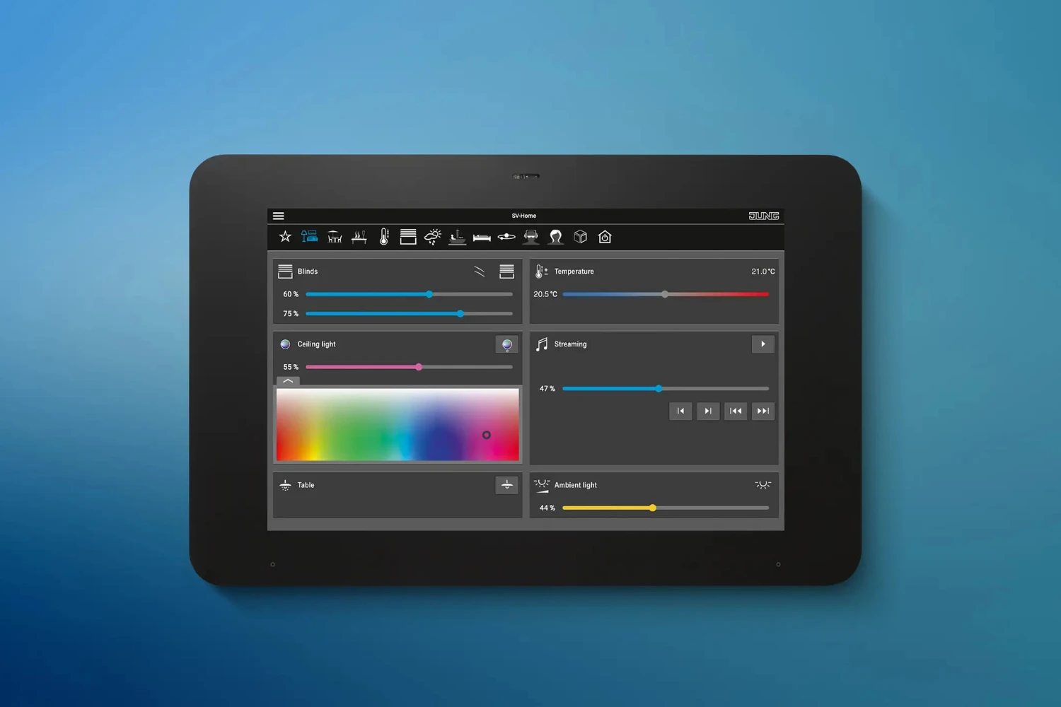 Панель поддерживает те же серверные решения, что и Smart Control 8 — Visu Pro, Smart Visu Server, eNet SMART HOME и Siedle Smart Gateway. Таким образом, она может использоваться как для KNX-установок, так и для беспроводных систем eNet. Интерфейс интуитивен и повторяет структуру старших моделей, обеспечивая единое пользовательское ощущение во всех помещениях.