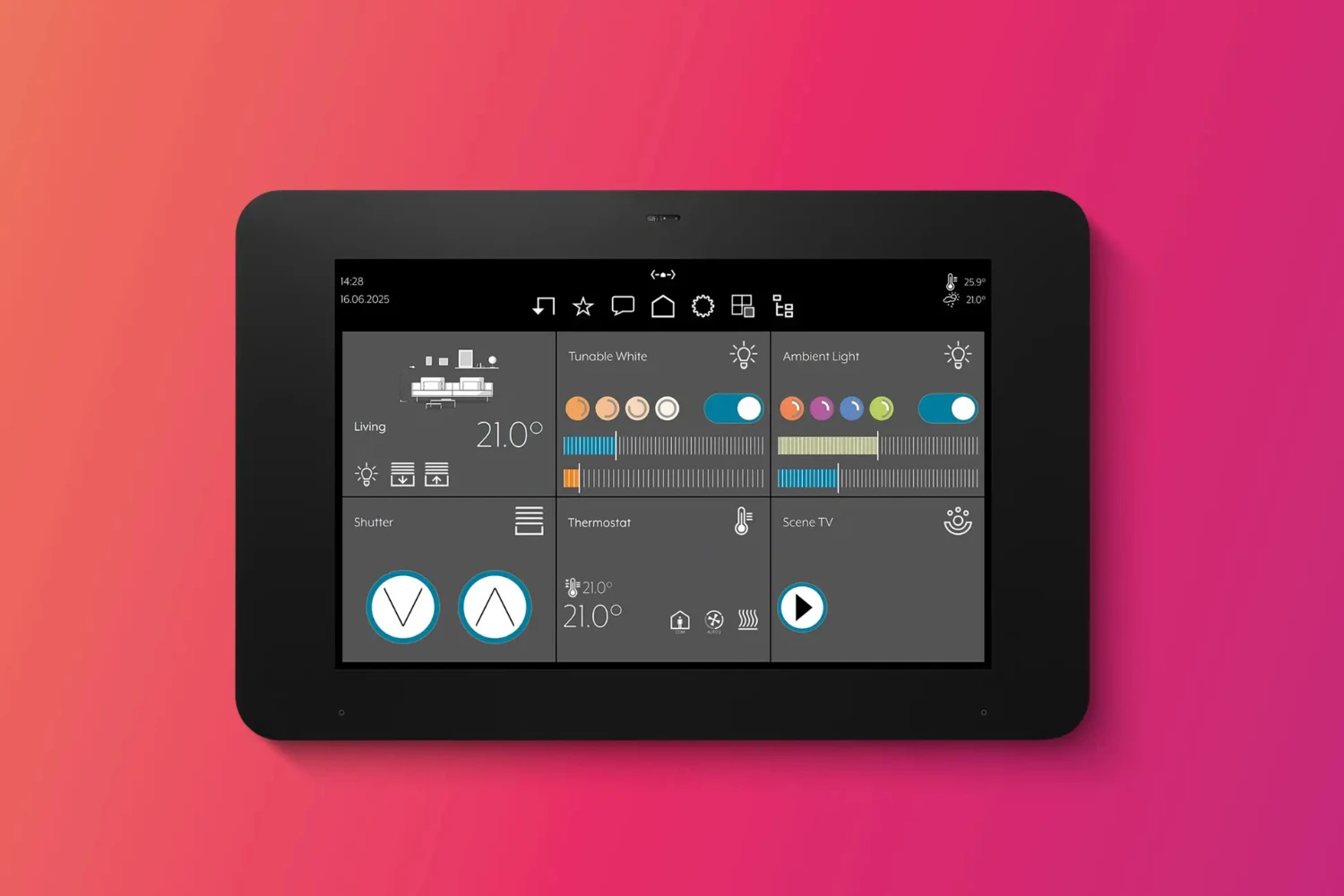 Панель регулярно обновляется, расширяя функциональность. Среди последних возможностей — передача значения точки росы на шину KNX для контроля микроклимата, интеграция уведомлений по e-mail и push, а также совместимость с домофонными шлюзами Siedle Smart Gateway.