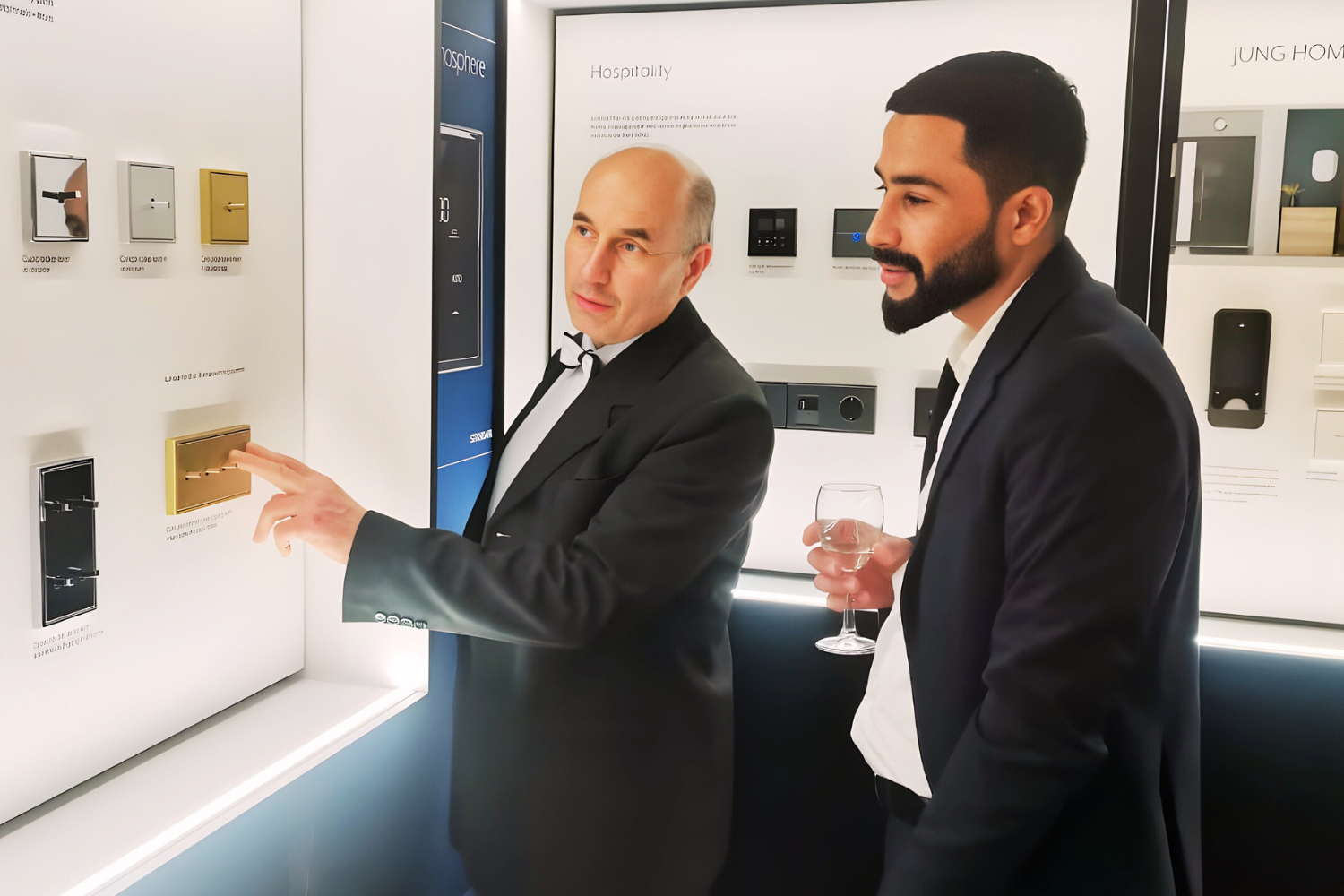 На церемонии отдельно выделялся стенд JUNG. Дизайнеры подходили к нему в течение всего вечера: рассматривали новинки, пробовали тактильные материалы, обсуждали механизмы и варианты отделок. Многие делились опытом работы с продукцией и спрашивали о деталях, которые важны в реальных проектах — от сценариев освещения до нюансов монтажа.